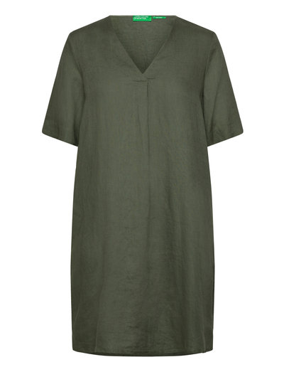 Denne kjole er et stilfuldt og komfortabelt valg til enhver lejlighed. Den har en afslappet pasform og en flatterende v-udskæring. De korte ærmer og knælange kant gør den perfekt til varmere vejr.