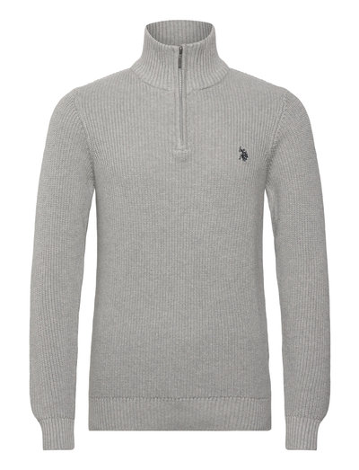 Denne striktrøje har en halv lynlåslukning, der giver alsidige stylingmuligheder. Den ribbede tekstur tilføjer dybde, mens den høje hals giver ekstra varme.