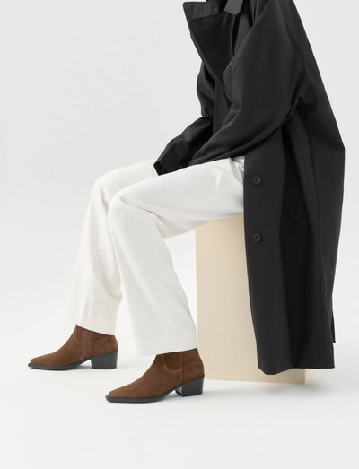 Denne minimalistiske ankelstøvle er defineret af western-inspirerede undertoner. Den er fremstillet i mørkebrunt ruskind og har en spids tå og en diskret blokhæl. En lynlåslukning i siden og en kromfri læderindersål fuldender designet.