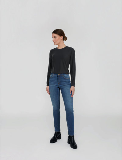 Denne top har lange ærmer og en klassisk O-hals, hvilket gør den til en alsidig tilføjelse til enhver garderobe. Den tætsiddende pasform skaber en elegant silhuet, der er perfekt til lagdeling eller til at bære alene.
