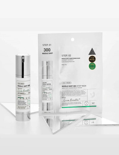 Mild Reedle Shot 300 2-trins maske er en avanceret hudplejebehandling, der forbedrer hudens struktur, minimerer porer og øger fugtigheden. Trin 1 indeholder en mikronål-inspireret ampul med 237.500 mikro Cica Reedles™, der er 14 gange mindre end størrelsen på porerne, hvilket stimulerer huden og forbedrer absorptionen. Trin 2 er en vegansk sheetmaske beriget med beroligende og fugtgivende ingredienser, der efterlader huden rolig og hydreret.
