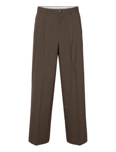 A pair of low waisted twill suit trousers cut to a loose fit. They feature a zip closure, slanted side pockets, back welt pockets, front pleats and back darts making them extra roomy, and front pressed creases for an extra tailored look.