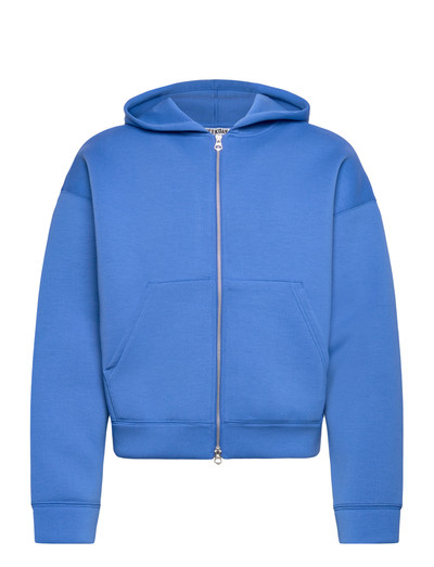 A regular fit zip hoodie made from a chunky scuba fabric with a recycled polyester and viscose blend, enhanced with a touch of recycled elastane. It has slightly dropped shoulders, ribbed cuffs and hemline, and a sturdy two-way front zipper.