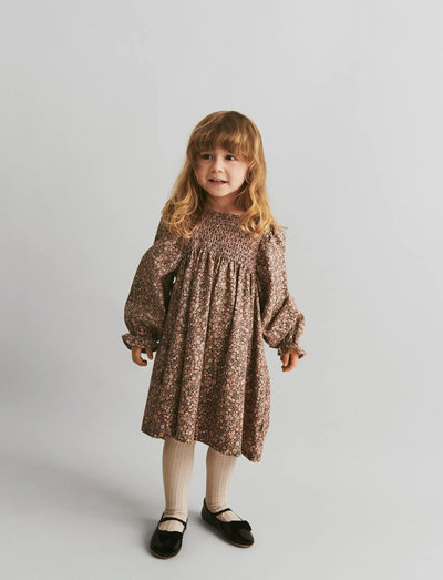 Lovely long-sleeved dress with smock detail made from soft organic cotton for children.- Square neckline- Wide smock panel across the chest- Fitted shape at the smock section- Long puffed sleeves with narrow elastic at the shoulders- Elastic with pleats and volume at the wrists- Cutline at the waist with pleats and a flared skirt- Buttom closure at backWheat's dresses are designed to be comfortable and should be a staple in your childs wardrobe. They can easily be dressed up or down depending on how you style the outfit.The smock detail ensures a close fit around the upper body, while the gathered waist adds volume to the skirt. All in all, a lovely dress for the many events of the autumn season.---- 100% Organic cotton- GOTS certified
