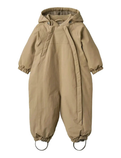 Practical snowsuit in breathable and waterproof fabric for your baby. - Regular fit- Lined with soft fleece- Hidden double zipper down the front- Detachable and adjustable hood- Rib collar- Elastic detail at the back for nice fit- Adjustable rubber strap under the feet- Elasticated cuffs and leg hems- ReflectorsWheat's technical snowsuits are breathable, durable and wind- and waterproof to ensure that your child stays warm and dry in the rainy and cold weather. It is also dirt repellent and therefore easy to clean. The suit is intended as outerwear for winter, as it is lined with soft fleece that makes it comfortable for your child to wear. It has many practical details such as a detachable and adjustable hood and a rib collar that makes it comfortable for your child to wear. The suit can unzip and open completely, so its easy for your child to get in it. ---Waterproof: 10.000 mmBreathability: 8.000 g/m2/24 hAbrasion resistance: 50.000 mmStandard 100 by OEKO-TEX®PFC-freeFlourine-free water and soil repellent finish (BIONIC FINISH ECO)Light weighted technical paddingTaped seamsGRS-certified---Outer shell: 100% Recycled nylonPadding: 100% Recycled polyesterFleece lining: 100% Recycled polyesterLining: 100% Recycled polyester