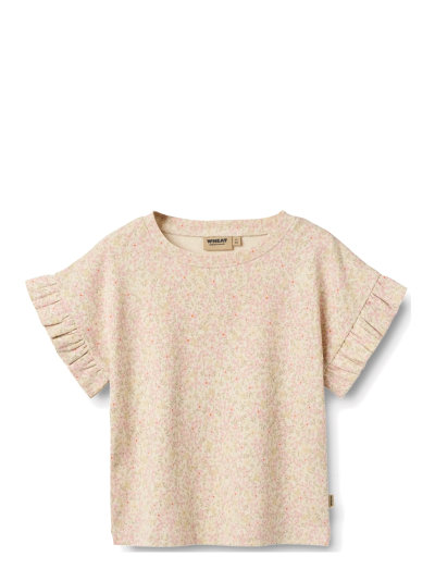 Short-sleeved T-shirt with signature floral print in soft organic cotton for children. - Loose fit- Dropped shoulders - Short sleeves- Ruffles at the sleeve hems- Signature printThis cute T-shirt is made from soft organic cotton, ensuring a comfortable and breathable fit for everyday wear. Designed with a playful look and a gentle stretch, it allows for easy movement, making it a versatile staple in your childs wardrobe. ---- Standard 100 by OEKO-TEX®- 100% Organic cotton- GOTS certified