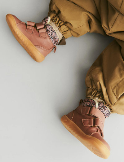 Comfy beginner booties with barefoot fit for your toddler.- Thin wool lining- Tex membrane - Barefoot fit- Details with Wheat signature printWheats boots are lightweight, flexible and comfortable for your child to wear and are made to protect the tiny feet, when they go off on their first adventures. The boots are designed with a Tex membrane that is 100% breathable and waterproof, providing excellent protection for your childs feet during the autumn and winter months. Prolonged exposure to very wet conditions may eventually allow moisture to seep through. For extended time in very wet environments, our winter rubber boots are recommended. The boots are made with LWG certified leather that is breathable and sweat absorbent to ensure good comfort for your child. The material is very durable and gets a wonderful patina over time. As a lovely detail, the boots have suede details on the top of the upper and at the heel. It has a latex inlay sole covered with wool, which is why these boots are perfect as winter boots, as they are both supportive and warm. It is normal in size with a firm grip on your child's foot. Recommended allowance for growth: 1-1,5 cmInner measurement:Size 19 = 12,1 cmSize 20 = 12,8 cmSize 21 = 13,5 cmSize 22 = 14,1 cmSize 23 = 14,8 cmSize 24 = 15,5 cmSize 25 = 16,0 cmSize 26 = 16,7 cm---Outer material: LWG certified leather as well as suedeLining: Thin 40% W