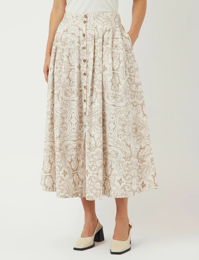 Denne nederdel er et stilfuldt og alsidigt stykke, der kan klædes op eller ned. Den har en knaplukning foran og en flatterende A-linje silhuet. Nederdelen er lavet af et let og behageligt stof, der er perfekt til varmt vejr.
