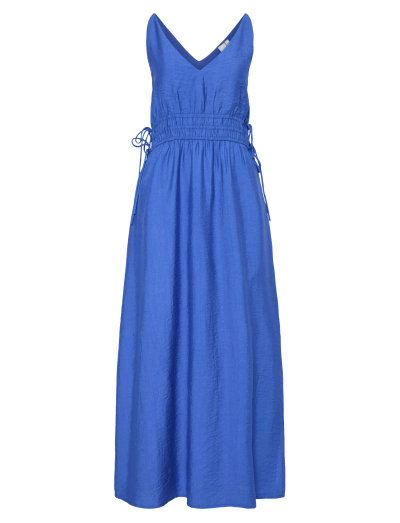 Denne ærmeløse ankellange kjole har en V-udringning. Den har en smokket talje og detaljer med snøre i siderne. Kjolen er lavet af et behageligt materiale. Den er perfekt til enhver lejlighed.