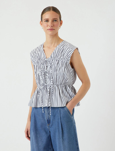 Denne ærmeløse top har et stilfuldt stribet mønster. Den har en V-udringning og en tætsiddende overdel. Taljen er snøret med en snor. Den har en let vidde i nederdelen. Et sofistikeret og alsidigt stykke.