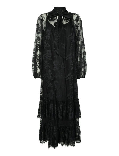 Denne lange kjole er fremstillet af delikat blonde og er perfekt til særlige lejligheder. Den høje halsudskæring og de lange ærmer tilføjer et strejf af elegance, mens sløjfen giver et feminint præg. Et polyesterfor sikrer en behagelig, ikke-gennemsigtig pasform.