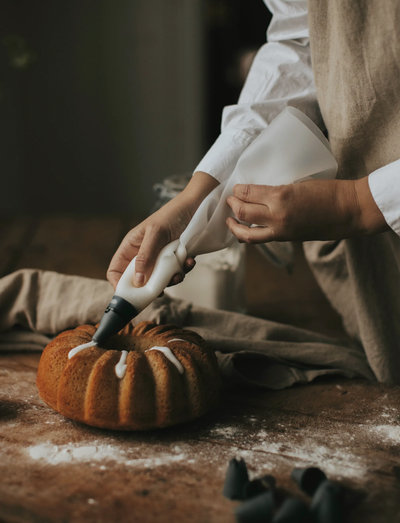 Sprøjtepose med 8 tyller i silikone. Til kreativ dekoration af kager og desserter. Tåler opvaskemaskine.