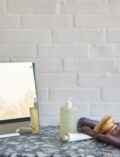 Rektangulært bordspejl i FSC®-certificeret træ til badeværelse eller soveværelse.
