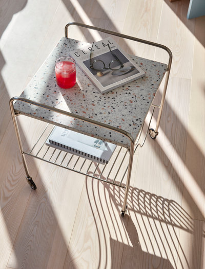 Add a touch of modern style to any room with the Wave Trolley. Constructed with a sturdy metal frame and a beautiful terrazzo/nickel finish, this trolley is an ideal way to store and serve your favorite items. Its two shelves provide ample space for books, dishes, and other items, making it perfect for any room. With its stylish design and quality craftsmanship, the Wave Trolley is sure to be a conversation starter.