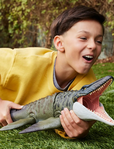 Denne Bite 'N Blast Mosasaurus-dinosaurfigur med sit karakteristiske havdesign bringer spændingen fra Jurassic World Rebirth-filmen hjem. En knapaktiveret 'bide'-funktion giver mulighed for dramatisk genaktivering af filmscener og inspirerer til kreativ leg. Børnene kan styre angrebet ved at holde halen og trykke på knappen for at få kæben til at åbne for at bide den lille dilophosaurusfigur, der er inkluderet, kan 'sluges' af den store mosasaurus! Tryk på knappen igen for at 'skyde' byttet ud igen! Med bevægelige led og et filmtro design på den 65 cm lange mosasaurus er den klar til både leg og udstilling. Scan sporingskoden under finnen med den gratis Jurassic World Play-app på en kompatibel enhed (Android eller iOS, medfølger ikke) for at få adgang til en digital version af dinosauren og spille dets drabeligt sjove spil med kapløb mod forskellige fartøjer på land, i luften og til vands. En god gave til dinosaurfans fra 4 år. Farver og mønstre kan variere.