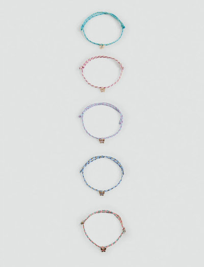 Featuring delicate braided bands, this set of five bracelets adds a touch of charm to any outfit. Each bracelet is finished with a small butterfly charm, making them perfect for stacking or wearing individually.