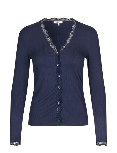 Delicate lace trim elevates this ribbed cardigan. Button-front closure and long sleeves complete the look.