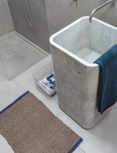 Dette håndvævede tæppe i 100% naturlig jute kombinerer funktion og æstetik på fineste vis. Det karakteristiske vævemønster giver overfladen struktur og liv, mens den varme lattefarve får et friskt modspil af en koboltblå bort. Måtten er kraftig og robust – Ideel ved havedøren, hoveddøren eller i entreen.