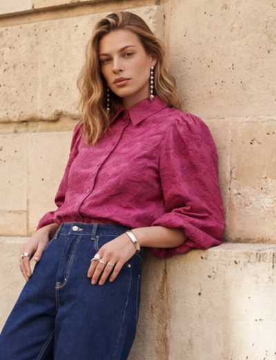 Detailed embroidery elevates this long-sleeve shirt. The design features a button-up front and gently puffed sleeves.