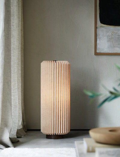 Med sin plisserede hørskærm spreder alba gulvlampe et blødt og stemningsfuldt lys. den mørkbejdsede mangotræsfod giver en flot kontrast til den naturfarvede skærm. designet er enkelt og elegant, hvilket gør, at lampen passer smukt ind i mange forskellige miljøer. alba leveres med en luksuriøs sort tekstilledning.