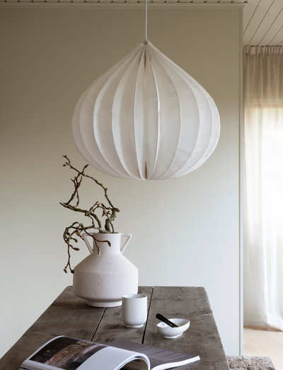 Med sin organiske bladlignende struktur er løgpendlen en spændende indretningsdetalje. når lyskilden tændes, kommer papirets fibre til syne og skaber en magisk og levende atmosfære. gå stort ud og hæng flere forskellige lamper fra indo-kollektionen sammen for at skabe et naturinspireret, skandinavisk look. papirmaterialet hedder tyvec og er et let og slidstærkt materiale med åndbarhed, som gør det meget modstandsdygtigt over for væsker og slid. loftkabelsæt medfølger.
