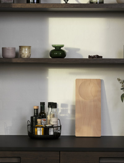 En måde at skabe forskønnende ro for øjet er at samle ting i grupper. Det gælder fx eddike- og olieflasker på køkkenbordet, men også ansigtsolier og parfumeflakoner på badeværelset. Til det formål er Inu-kurven genial. Med sine 22 centimeters bredde og blot 8 centimeters højde passer den ind mange steder uden at optage for meget bordplads. Det transparente trådlook i øverste del giver et let udtryk, mens den gennemgående bundplade sikrer stabilitet.