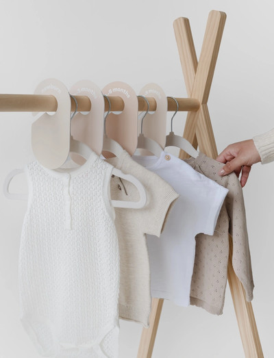 Smart wardrobe dividers for organizing your child's new and inherited clothes from a friend in the wardrobe. The set comes with 8 wardrobe dividers labeled with age on both sides.