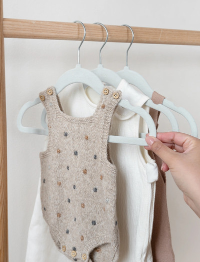 The hanger has a velour finish with a non-slip surface, and small recesses for straps, which together ensure that the clothes sit firmly on the hanger without falling down.