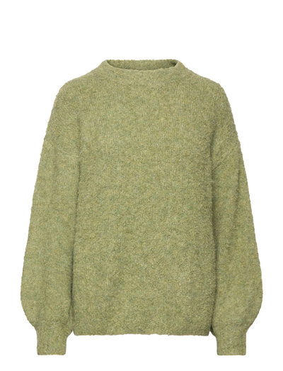 See lõdva silmkoeline kampsun on kõrge kaelusega ja mugava, ülemõõdulise lõikega. Varrukad on kujundatud peene puhviefekti ja lõdva, langeva õlaga, mis teeb sellest stiilse ja hubase valiku.