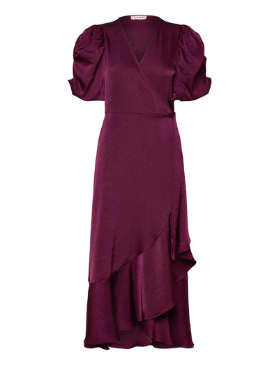 See luksuslikust satiinilaadsest kangast valmistatud ümbriskleit on elegantsete puhvis lühikeste varrukate ja asümmeetrilise kroogitud äärisega. V-kaelus lisab sellele peenele rõivale meeldiva puudutuse.