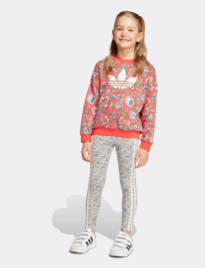Arhiivikujunditest inspireeritud lilleprindid iseloomustavad seda mugavat komplekti. See komplekt, mis sisaldab avara ülaosa ja liibuvaid retuusid, on valmistatud pehmest puuvilla ja taaskasutatud polüestri segust. Ülaosa ikooniline trükitud Trefoil-logo ja retuuside tikitud Trefoil-logo lisavad sportlikku stiili. See mitmekülgne komplekt sobib suurepäraselt pargis mängimiseks või kodus lõõgastumiseks ning sobib hästi tossude või sandaalidega.