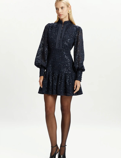 See minikleit on kaunistatud õrna tikandiga ning sellel on kõrge krae ja nööbitav liist. Disainil on puhvis varrukad nööbitavate mansettidega ja liibuv seelik mängulise volangiga.