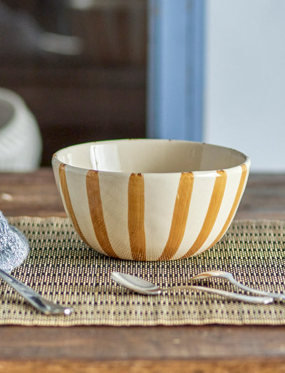 The Begonia Bowl by Creative Collection is crafted from stoneware featuring a hand-painted striped design. Ideal for servings or enhancing your decor, each bowl, with its hand-painted detail, boasts its own distinctive character.