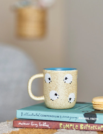 The Dolly Cup by Bloomingville MINI is made of stoneware and decorated with a charming sheep pattern. Featuring a beige exterior and a glazed blue inside, it’s ideal for everyday use.