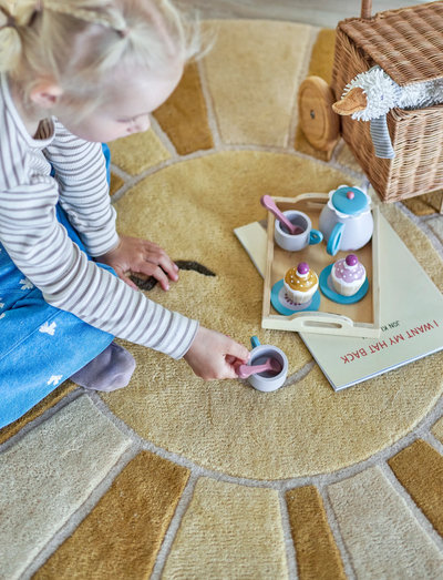 The Sun Rug by Bloomingville MINI is made of wool and features a round design with a friendly sun motif. Its warm colors and soft expression make it a cozy addition to any kids’ room.