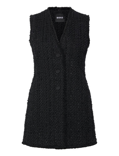 Tekstuurkangas rõhutab seda varrukateta bleiserit, lisades igale komplektile elegantse puudutuse. Kahe nööbiga disainil on V-kaelus ja nööpkinnitus, mis tagab kohandatud silueti. Ideaalne kihiliseks kandmiseks või eraldi kandmiseks, see rõivas lisab viimistletud ilme nii vabaaja- kui ka pidulikele rõivastele.