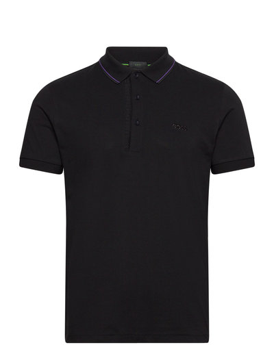 ESSENTIAL polo crafted from responsible oxford pique CmiA quality fabric. It includes logo placket knitted in tonal polyester, two stripes on the collar, and a small tonal BOSS logo on the chest, emphasizing sustainability and style.