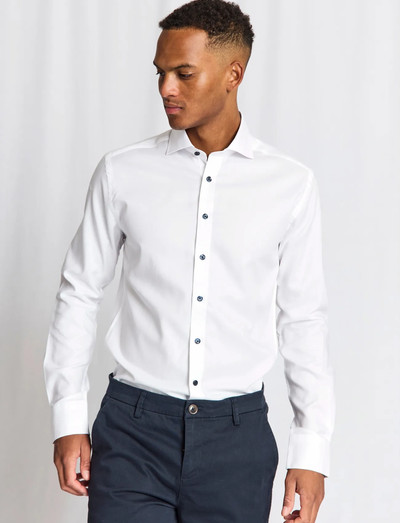 Ümber lõigeSee slim fit särk on valmistatud dobby-koes puuvillast ja annab elegantse silueti. Klassikalisel särgil on cutaway-kraega ja reguleeritavad mansetid, samas kui prantsuse nööbiliist on kaunistatud tumesinist värvi pärlmutter nööpidega, mis lisavad pidulikule riietusele rafineeritud puudutuse.