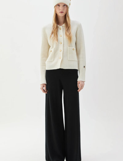 See kardigan-stiilis jakk on valmistatud villasegust ning sellel on eriline kootud struktuur ja muster. Klassikalise lõikega, puusadel istuv mudel on varustatud praktiliste pealeõmmeldud taskutega ja esiküljel ning taskutel on iseloomulikud kuldsed B-nööbid.