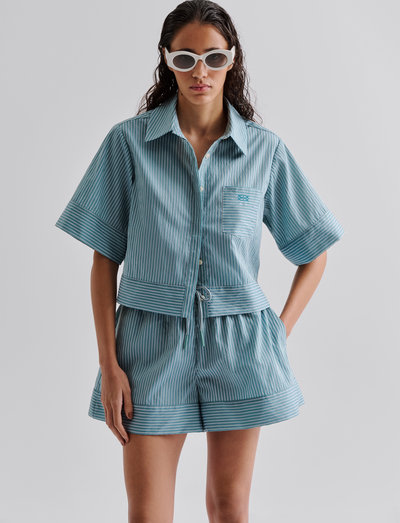 Triibuline muster iseloomustab seda lühikest särki, lisades visuaalset huvi. Sellel on esitasku ja peidetud nööpkinnitus, mis tagab sujuva välimuse.