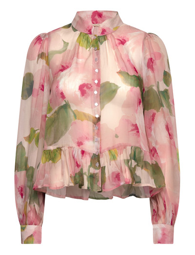 See pluus on valmistatud elegantsest, kergelt läbipaistvast FSC-sertifikaadiga viskoosist ning sellel on sirge lõige ja pikad varrukad, millel on kandilised mansetid. Mandariinikrae ja eest nööbitav esiosa lisavad klassikalist hõngu, samas kui allääre voolav volang annab mängulise viimistluse.