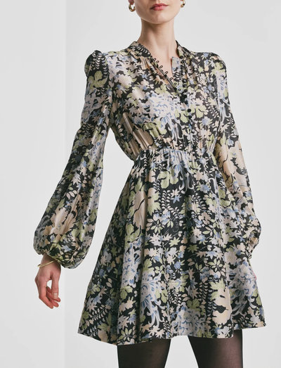 See minikleit on valmistatud elegantsest, kergelt läbipaistvast tekstuursete triipudega viskooskvaliteedist. Kleit on minipikkusega, taljes elastne vöökoht, A-lõikeline seelik, mandariinikrae, millel on nööbid ülaosas, ja pikad varrukad elastsete mansettidega. Sellel on küljel tõmblukk.