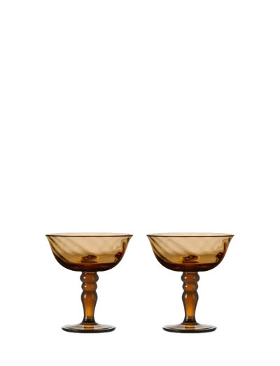 Our Italian coupe draws inspiration from the vineyards, where this small glass exudes luxury and holds just the right amount of beverage to keep it chilled. Beautifully crafted and delicate, it's perfect for a small drink or dessert. Adorned with a charming striped pattern and made from coloured glass for added allure. The colour, a stunning brown hue, complements any setting. In the Opacity Brown collection, you'll also find a champagne coupe, wine glasses, and round water glasses. Designed by Byon Studio. Delivered in a 2-pack within a Byon box.