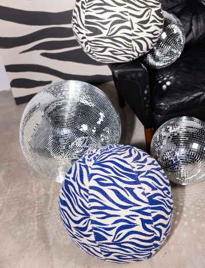 A luxurious and playful round zebra-patterned pillow crafted in premium bouclé. Its round shape makes it perfect for tossing around in your favourite corner. The textured surface enhances the sofa experience, and the certified cotton construction ensures an eye-catching statement wherever you place it. Diameter 35 cm. Inner cushion included. Available in black and blue. Handwash only. Design Byon Studio.