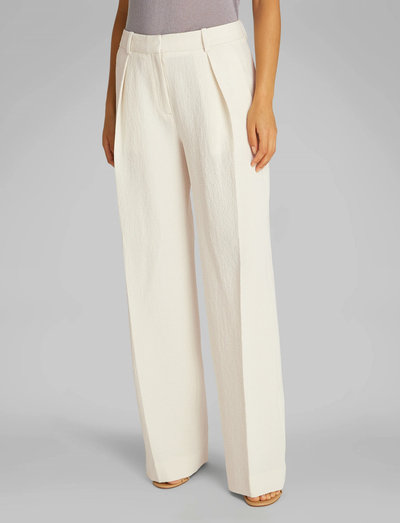 Need laie säärega püksid on valmistatud pehmest seersucker-kangast. Neil on klassikaline disain kõrge vöökohaga ja lõdvestunud istuvus. Püksid sobivad nii igapäevaseks kui ka pidulikuks kandmiseks.
