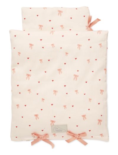 Pretty Doll's voodipesu 100% orgaanilisest puuvillast. Komplekti kuuluvad nukupadi ja padi, mõlemad orgaanilise täidisega. Täiendava rafineerimisena on alläärde kinnitatud väikesed vibud. Nuku voodipesu sobib Cam Cam nuku voodile.