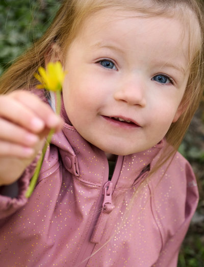 TuulekindelPractical rainwear set in PU from CeLaVi. The set consists of a jacket with an all-over glitter print and a solid-colored bottom. The trousers have adjustable suspenders and click buckles up to size 110, after which they come without suspenders. The trousers have practical and adjustable elastic straps that can be pulled under the footwear. The jacket closes with a waterproff zipper. There are narrow reflective stripes around one arm and one leg. At the top of one arm and on the back of the hood, the logo is printed with a reflective finish. The CeLaVi rain jacket has a detachable hood that is fastened with snap buttons. The hood opening, sleeves, and waist have elastic for a better fit. The set has a water column pressure of 10,000 mm. Certified acc. to GRS - Made with 66% Recycled Material CERES-0366