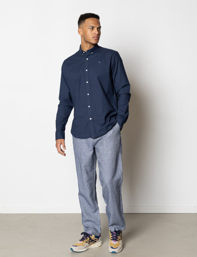 A staple in every man's wardrobe: our classic oxford shirt. Made from soft cotton fabric with a touch of stretch for comfort. It features a small logo on the chest, tailored fit, button-down collar, and striped contrast fabric inside the collar. The model is wearing a size Large (188 cm tall).