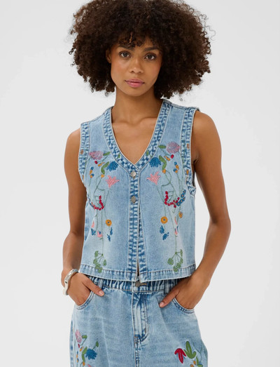 Lilleline tikand lisab sellele teksavestile veidi omapära. Varrukateta disain muudab selle ideaalseks kihiliseks riietumiseks, samas kui eest nööbitav esiosa võimaldab mitmekülgset stiili.