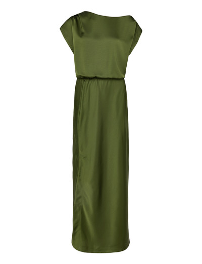 See maksikleit on valmistatud voolavast taaskasutatud satiinist ja õhkab modernset elegantsi. Sellel on asümmeetriline õlgu paljastav kaelus ja lõõgastunud bluson-pihaosa. Pikk seelik loob rafineeritud kuju, mida täiustab kõrge küljelõhik, mis tagab liikumisvabaduse. Tagaküljel olev elastne vöökoht tagab mugava istuvuse.